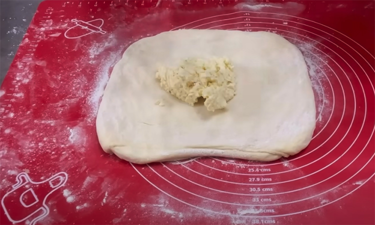 Per il ripieno, mescolare la ricotta, il formaggio grattugiato, l’uovo e il burro ammorbidito. Dividere l’impasto in porzioni, arrotolarle ciascuna in un cerchio. Disponete il ripieno al centro, poi portate i bordi verso il centro e pizzicate. Arrotolare la palla risultante in una torta piatta. Ripetere l’operazione con l’impasto rimanente e il ripieno.